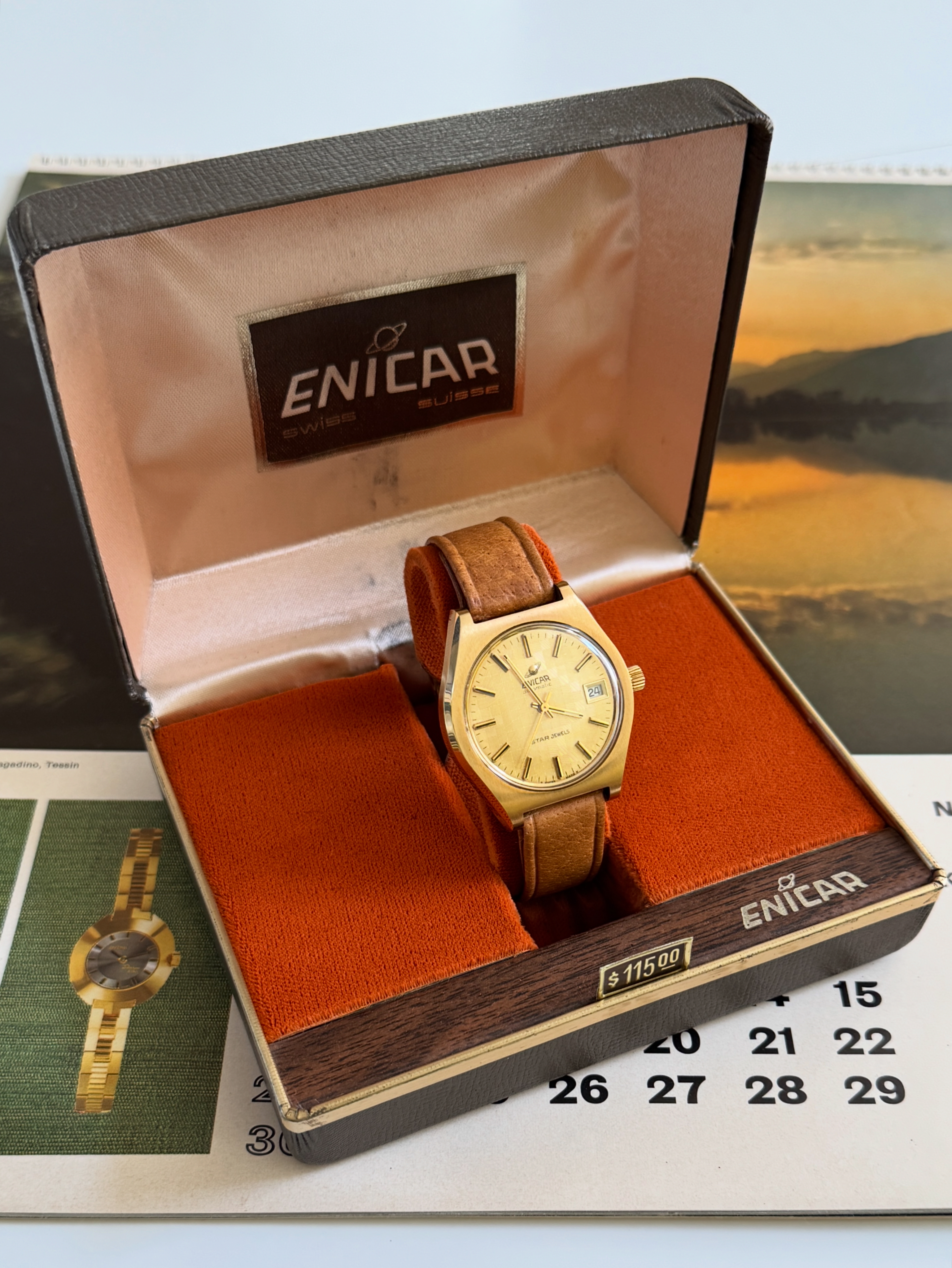 Lug size is 18 millimeters. I have matched the watch with a new old stock brown leather strap and a gold tone Enicar clasp, since the original strap was completely dried out. And as a bonus, the original Enicar presentation box is included. Viva 1970s faux wood!